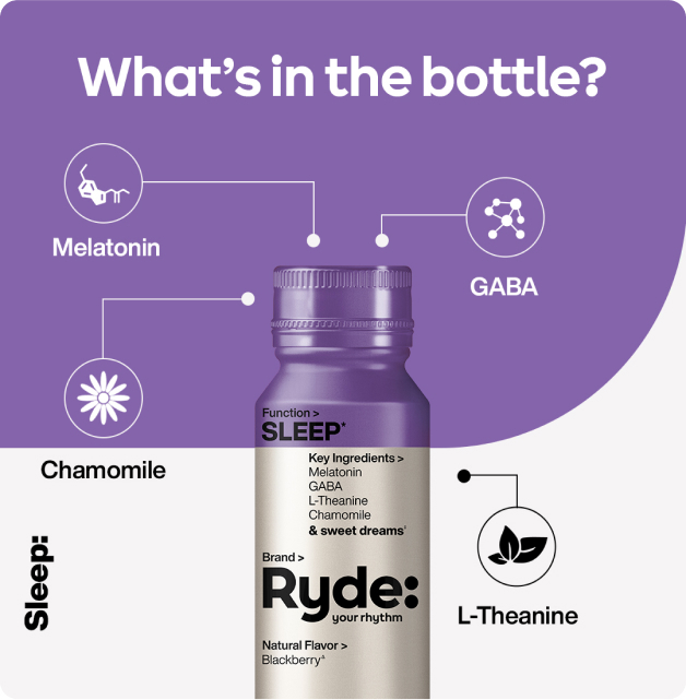 Ryde: SLEEP includes our smartly formulated combination of ingredients: Melatonin, GABA, L-Theanine & Chamomile – designed to help you go from ‘can’t sleep’ to ‘sweet dreams.’